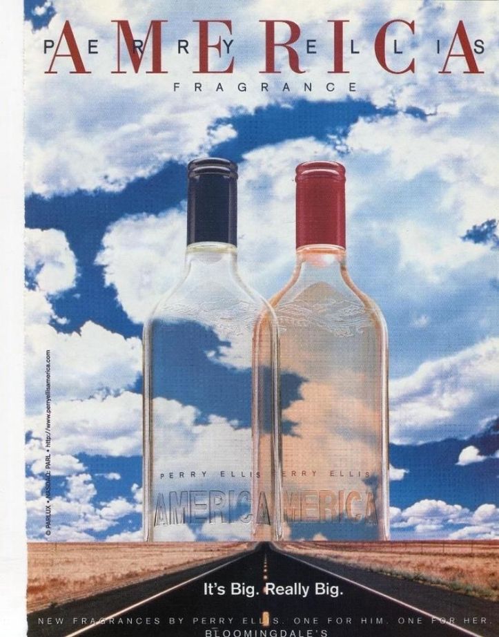 Spacious skies, amber waves of grain, the open road…this print advertisement for Perry Ellis America (1996, now discontinued) has everything.