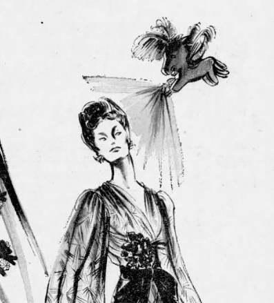 One last note: some of the department store ads for the Blue Grass collection seemed to draw from Arden’s own illustrated ads, adapting them for local audiences. The Vertès ad was made more pedestrian for Montreal’s Gazette, and the above vignette seems to borrow the woman’s blank expression and backward-leaning pose from the uncredited illustration (which borrowed them from Fuseli)…adding the “perfume pin” as a tiny hovering horse that sprays her passive figure with Blue Grass.