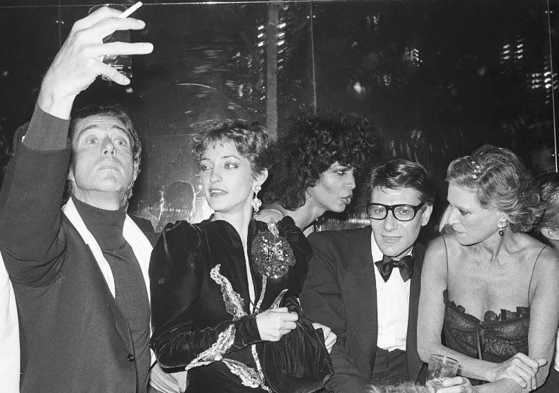 First image: Halston advertisement, 1979, featuring Pat Cleveland and Sterling St. Jacques. Second image: Halston, Loulou de la Falaise, Potassa, Yves St Laurent, and Nan Kempner at Studio 54 in 1978. Photograph: Sonia Moskowitz/Getty Images.