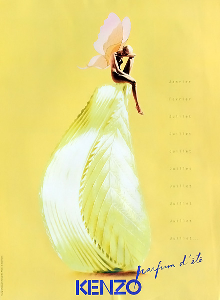 I don’t remember that woman’s name, but she was an excellent salesperson. Without making me feel pressured, she invited me to try several perfumes and told me a little about each. Givenchy Amarige was among them; she described it as “a joyful perfume.” The one that caught my interest was Kenzo Parfum d’Été (1993, Jean-Claude Delville and Christian Mathieu). I liked the translucent leaf-shaped bottle and I found the fragrance pleasing too. Best of all: I was able to read a list of its notes, a rare opportunity at that time.