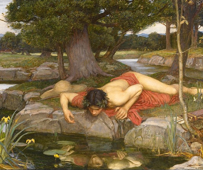 I’m sure you’re familiar with the concept of narcissism, or perhaps with the lowercase-n narcissus flower, but I’ll recap the original story here, with the assistance of my yellowed copy of Robert Graves’ The Greek Myths and a translation of Ovid’s Metamorphoses (by Anthony S. Kline)…