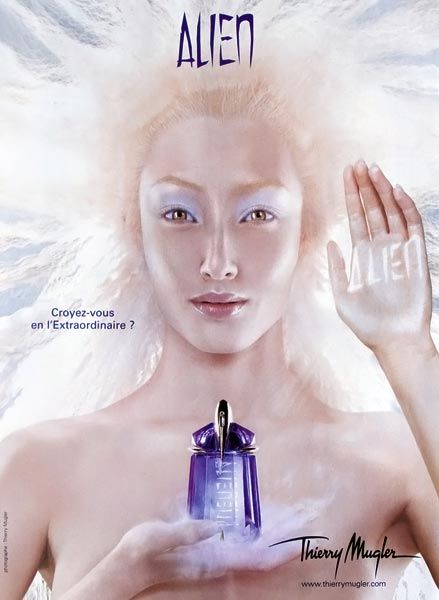 On ALIEN (2005): “When creating Alien, I dreamed of a fragrance that would reveal the radiance and splendor of every woman. Rather than a fragrance of seduction, Alien is designed as a sacred talisman charged with positive energy. . . . the power of a Solar Goddess who radiates, fascinates and captivates with her benevolence, in a society questing for spirituality and new values.” (quote via Candy Perfume Boy)