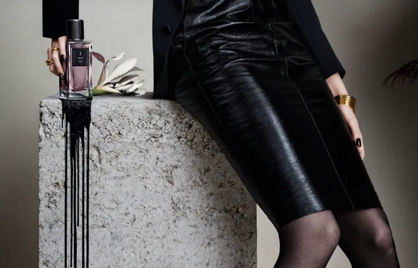 The signature photo for YSL Muse (Inspiring Ink), with that single crumpled flower lying on a marble plinth and those streams of ink dripping down from the perfume bottle (plus the black nail polish and leather pencil skirt!) is the kind of upscale-goth visual that catches my eye and tells me to make a mental note for my next visit to Bloomingdale’s or Bergdorf.