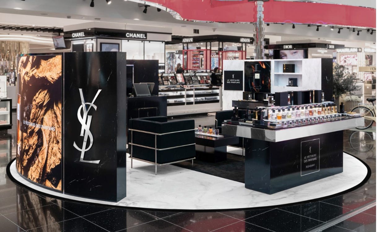 A YSL x Dubai Duty Free counter, surrounded by other luxury beauty counters, in 2023.